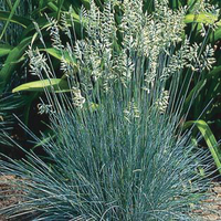 Tufted, very blue grass with spikes of violet flushed, blue-green flowers.