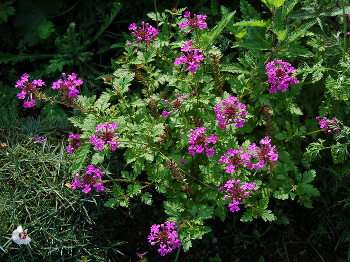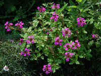 Compact trailing deeply cut foliage with small clusters of bright pink flowers.